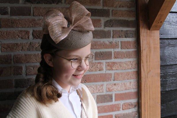 Rond model in paper materiaal, doorsnee van 18 cm, geschikt voor de royalere hoofdomtrek zowel voor kinderen als dames. Vanaf hoofdomtrek 53 cm. Model is op haarband. We zetten hier standaard een hoedenelastiek in voor een betere aansluiting op het hoofd, dit elastiek kan naar wens strakker of losser in de band gezet worden.