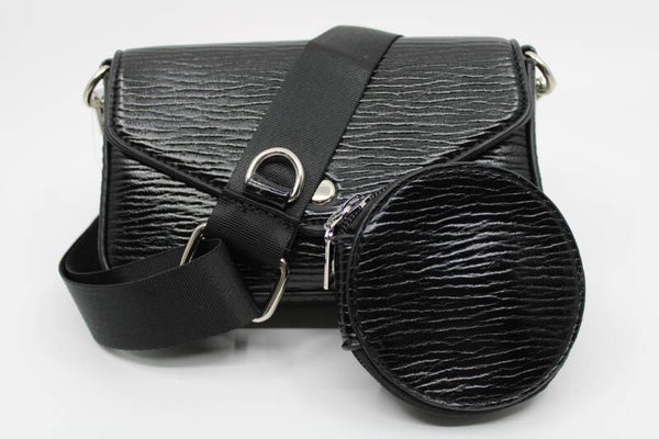 Glanzend materiaal met iets een motief. Leuke tas met bijpassende portomonee. Een wat bredere schouderband voor een leuk effect als ze het om zich heen dragen.