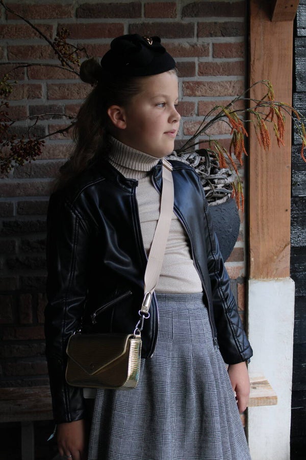 Glanzend materiaal met iets een motief. Leuke tas met bijpassende portomonee. Een wat bredere schouderband voor een leuk effect als ze het om zich heen dragen.