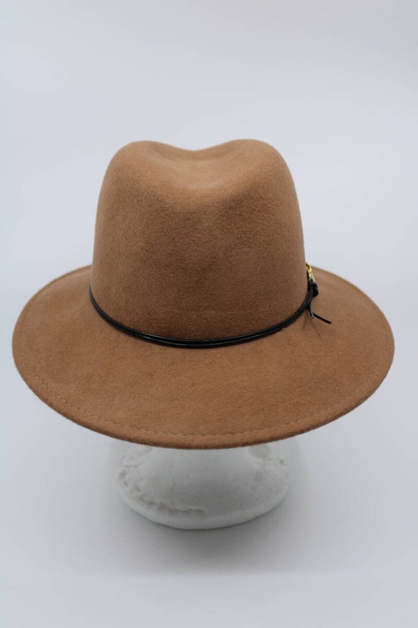 Gleufhoed van vilt met zwart leerkoord en gouden schakel gesp.
