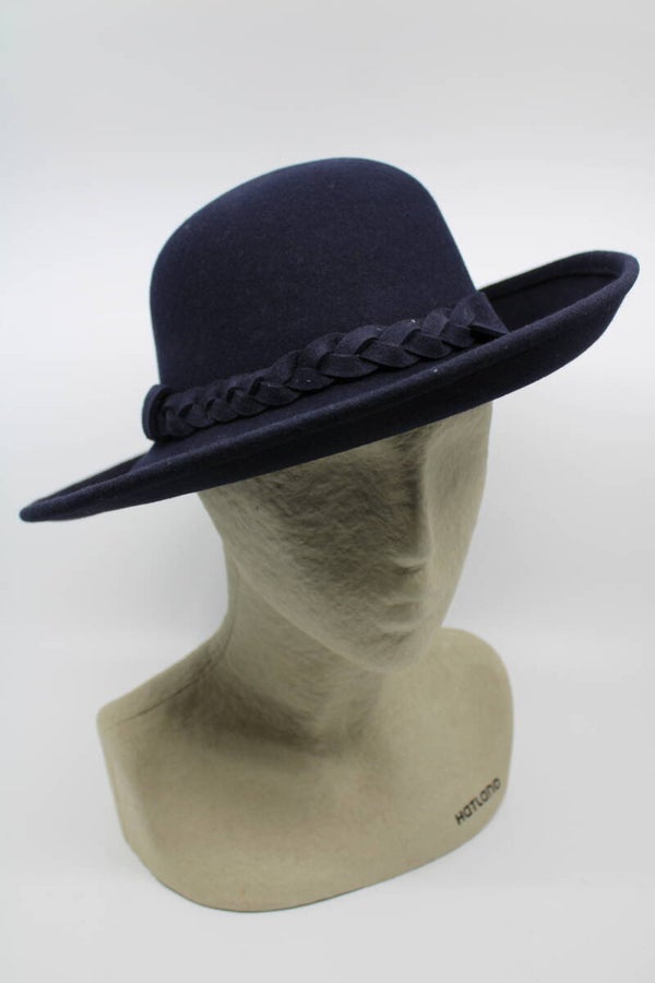Model heeft een ronde bol, opgeslagen rand en luxe afgewerkt met gevlochten band van hetzelfde materiaal als de hoed.