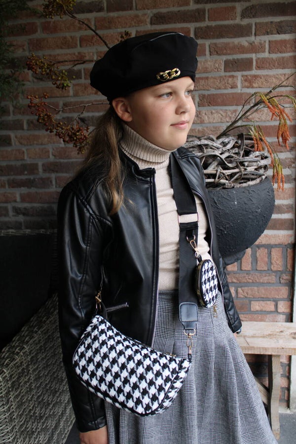 Zwarte baret met leren bovenkant en leren strik als garnering.