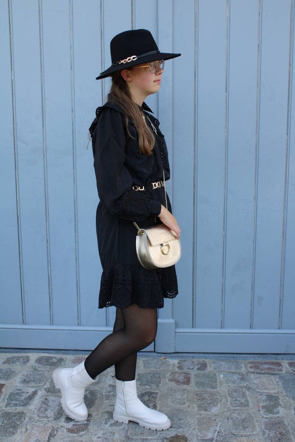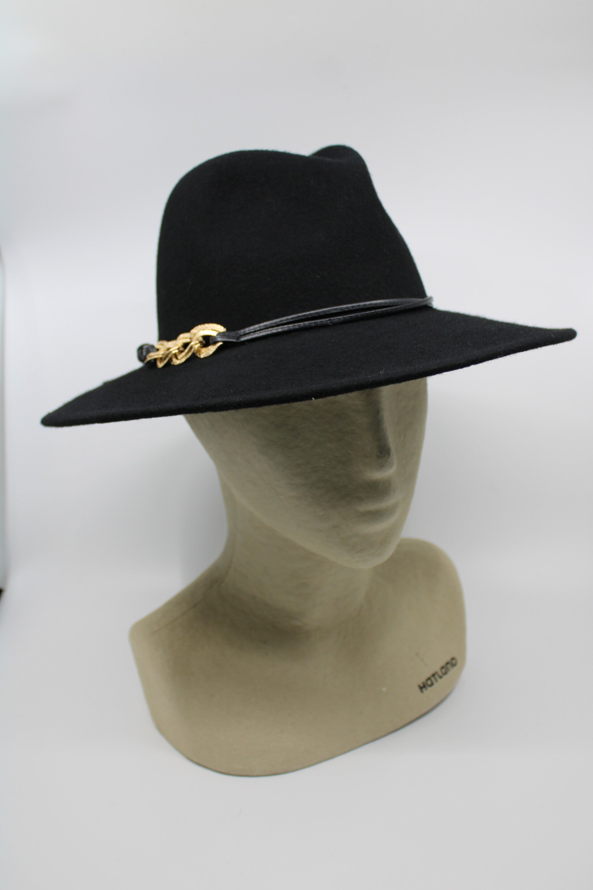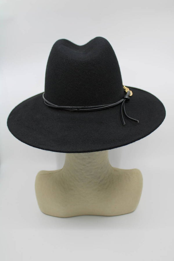 Neutrale gleufhoed met een gemiddelde rand van 8 cm en een 11 cm hoge bol. Leuke garnering met een gouden schakel en leerkoord.