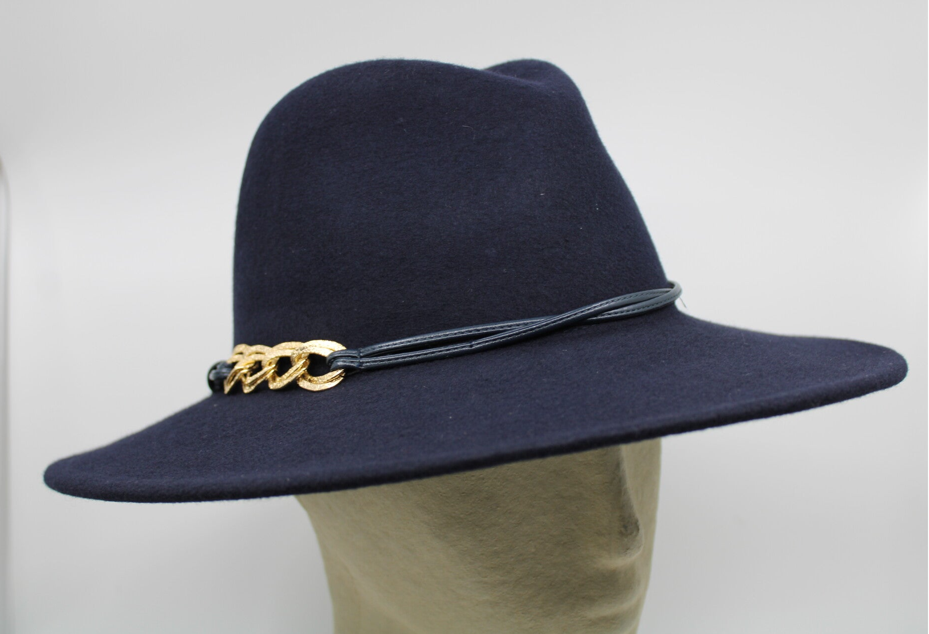 Neutrale gleufhoed met een gemiddelde rand van 8 cm en een 11 cm hoge bol. Leuke garnering met een gouden schakel en leerkoord.