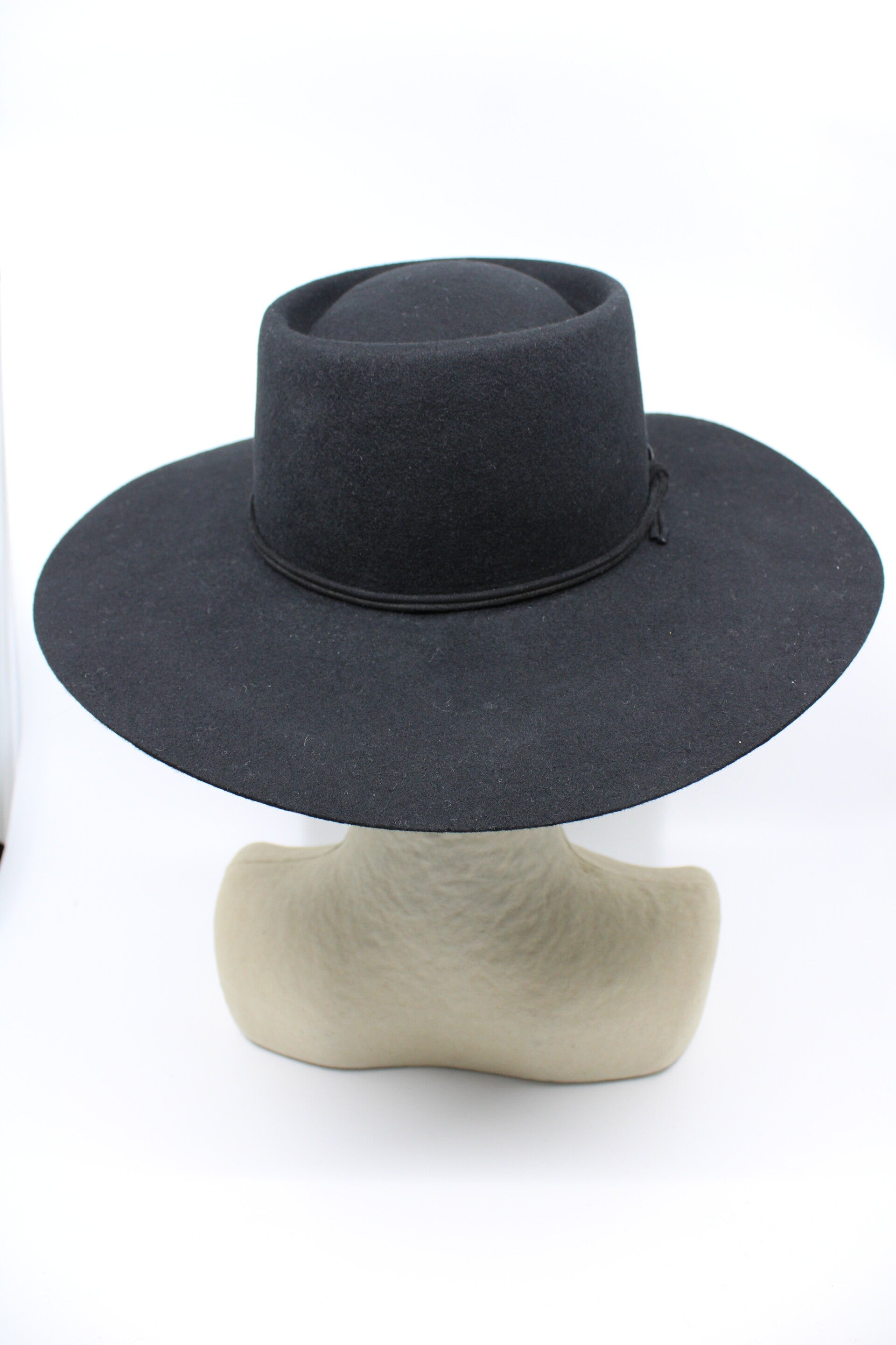 Hoed met rechte bovenkant en golvende flexibele rand. Afgewerkt met een leren koord en schakel. verkrijgbaar in 2 maten.