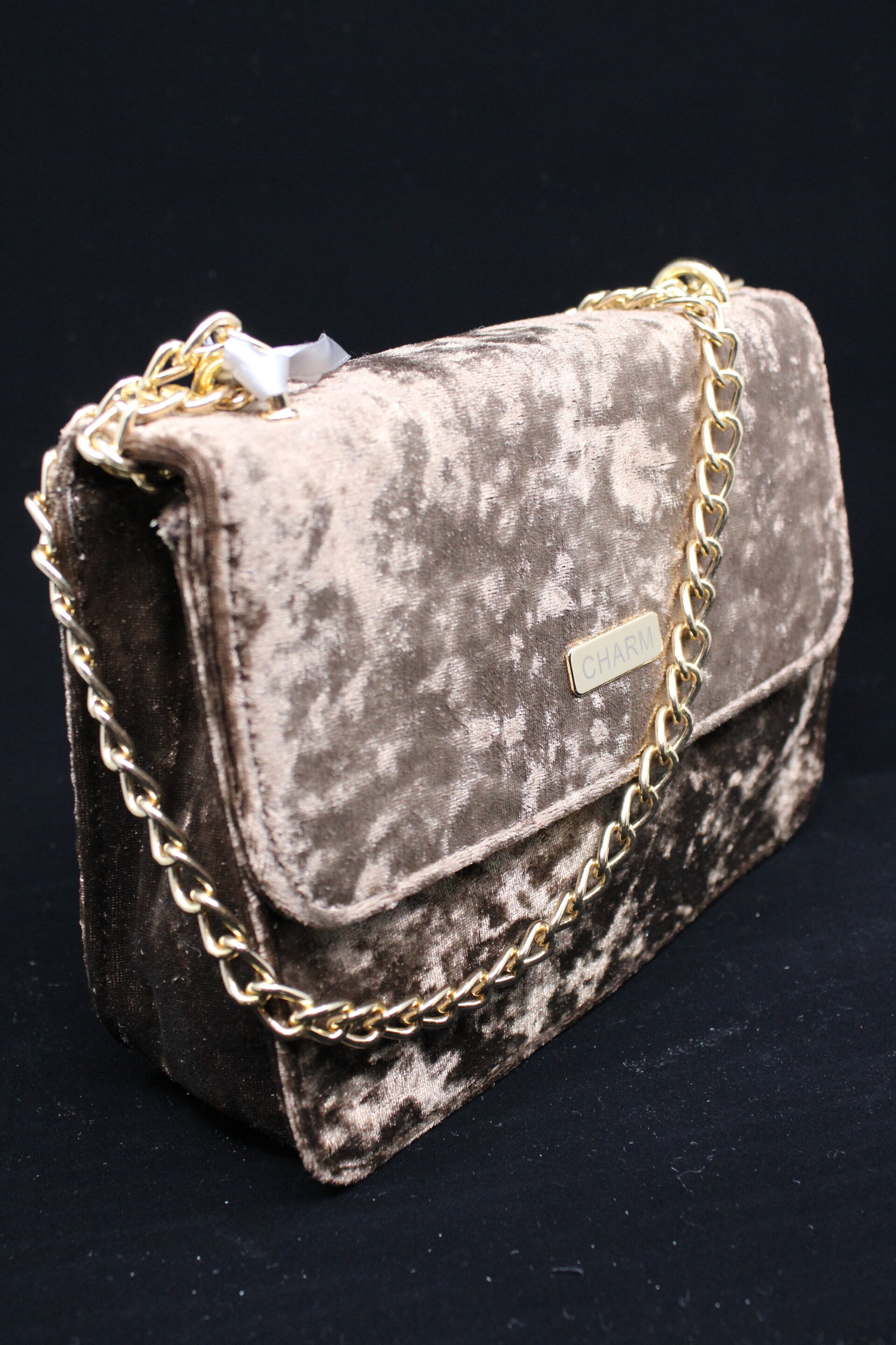 Leuke chique tas, materiaal geeft de uitstraling! Met goudkleurige schakel ketting als schouderhengsel. 20 cm breed, 14cm hoog.