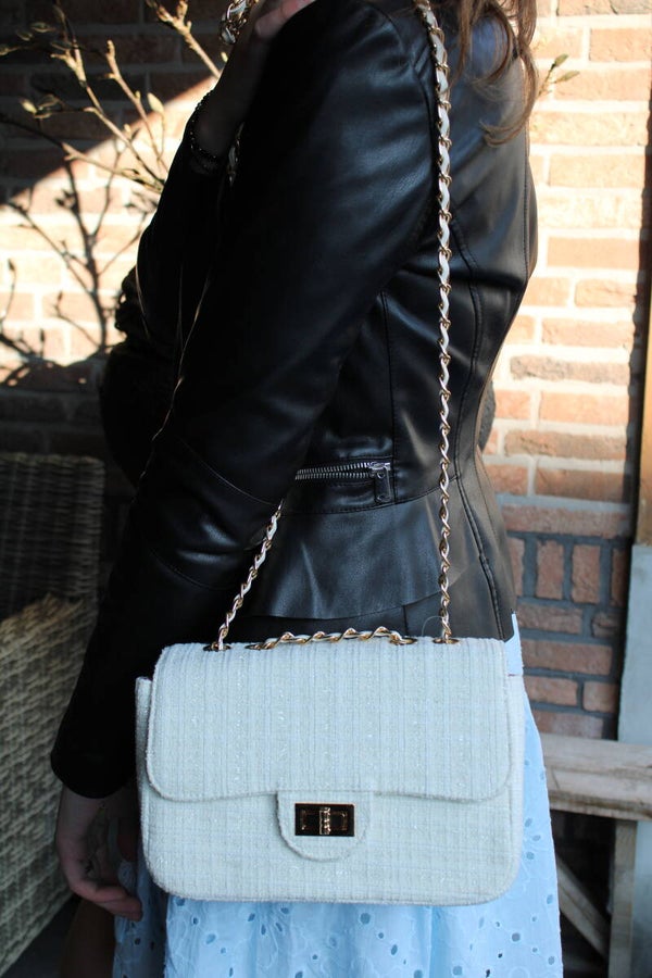 Boucle materiaal in off white/goud. Met goudkleurige details.