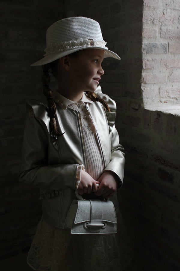 Afgewerkt met een boucle rand in de kleurstelling passend bij de kleur van de hoed. Goudkleurige gesp en merklabel.