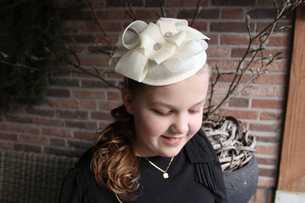 Laag dopje op haarband met royale garnering. Leuk om schuin naar het voorhoofd toe te dragen. Met bijpassende diadeem. Geschikt voor hoofdomtrek vanaf 53 cm.