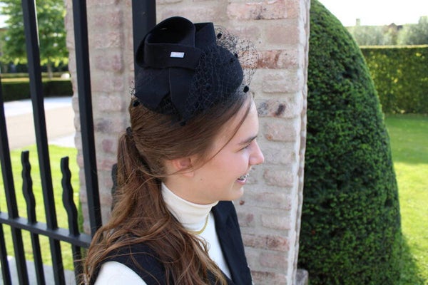Schuin model, voor een mooie pasvorm. Prachtig afgewerkt met vilten garnering, merklabeltje en voile. Geschikt vanaf hoofdomtrek 56 cm.