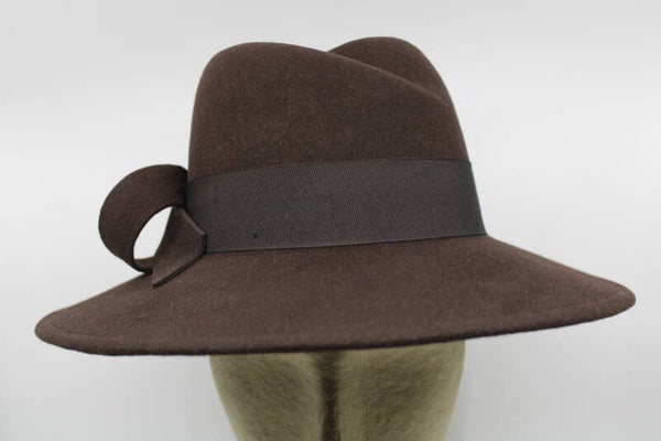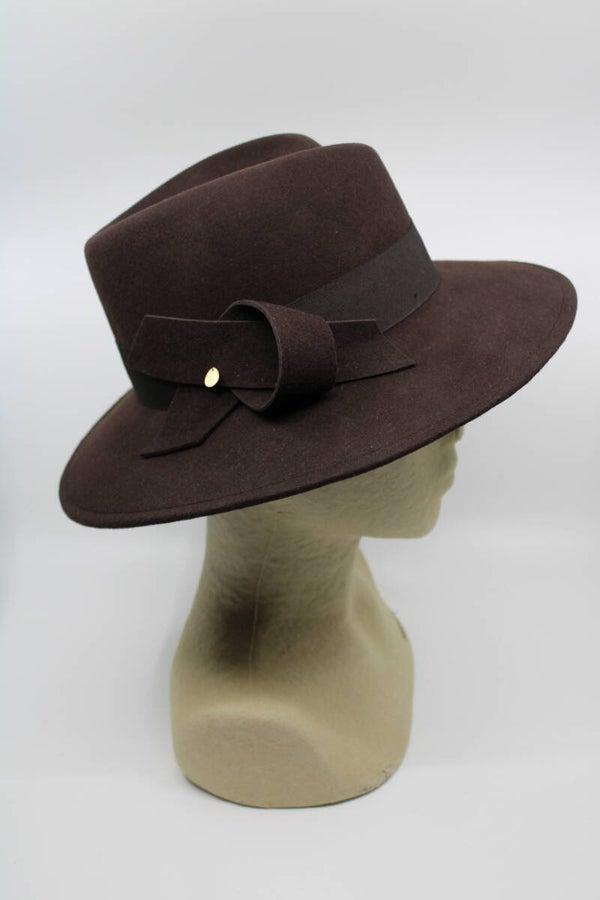 Model heeft een a-symmetrische gleuf aan de voorzijde. Met een rand van 8 cm en een hoogte van 11cm aan bol is het een middelgrote hoed en daarmee een heel gangbaar model. Luxe afgewerkt met een gouddetail. Geschikt voor hoofdomtrek 56 tm 58cm.