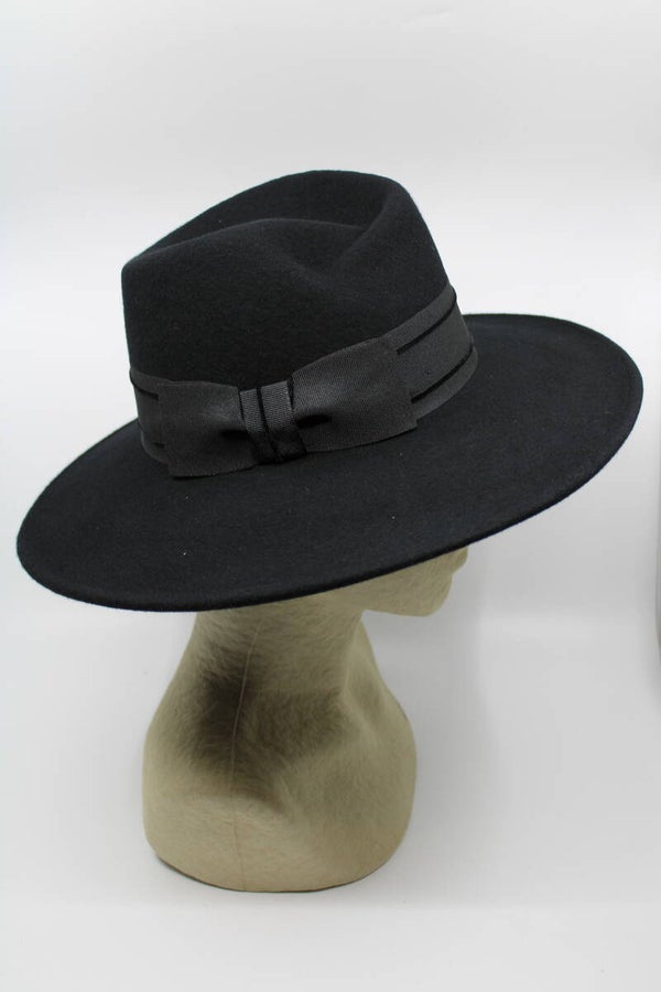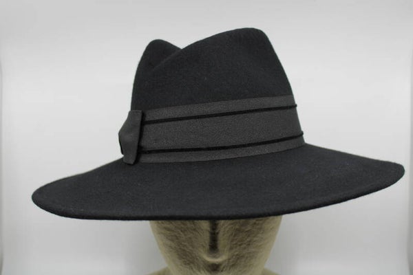 Hoed met a-symmetrische bol, geeft net een iets andere look. Afgewerkt met een brede band waarin velours verwerkt is. Verkrijgbaar in 2 maten.