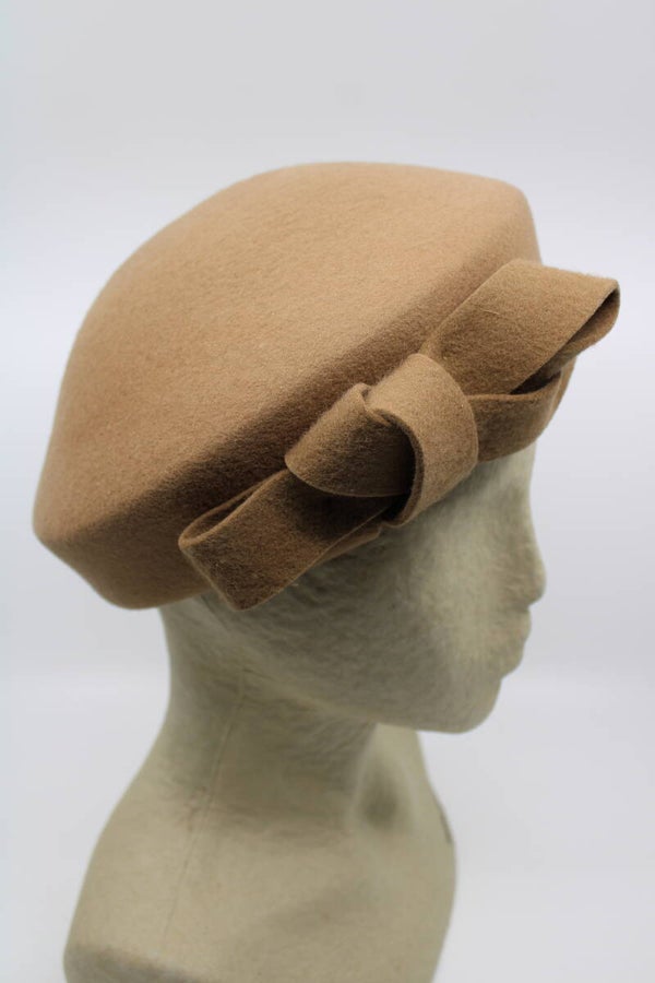 Royale dop die zowel op het voorhoofd als naar achteren gedragen kan worden. Vilt garnering links voor. Model loopt naar achteren toe iets af. Geschikt voor hoofdomtrek 56 tm 58cm.