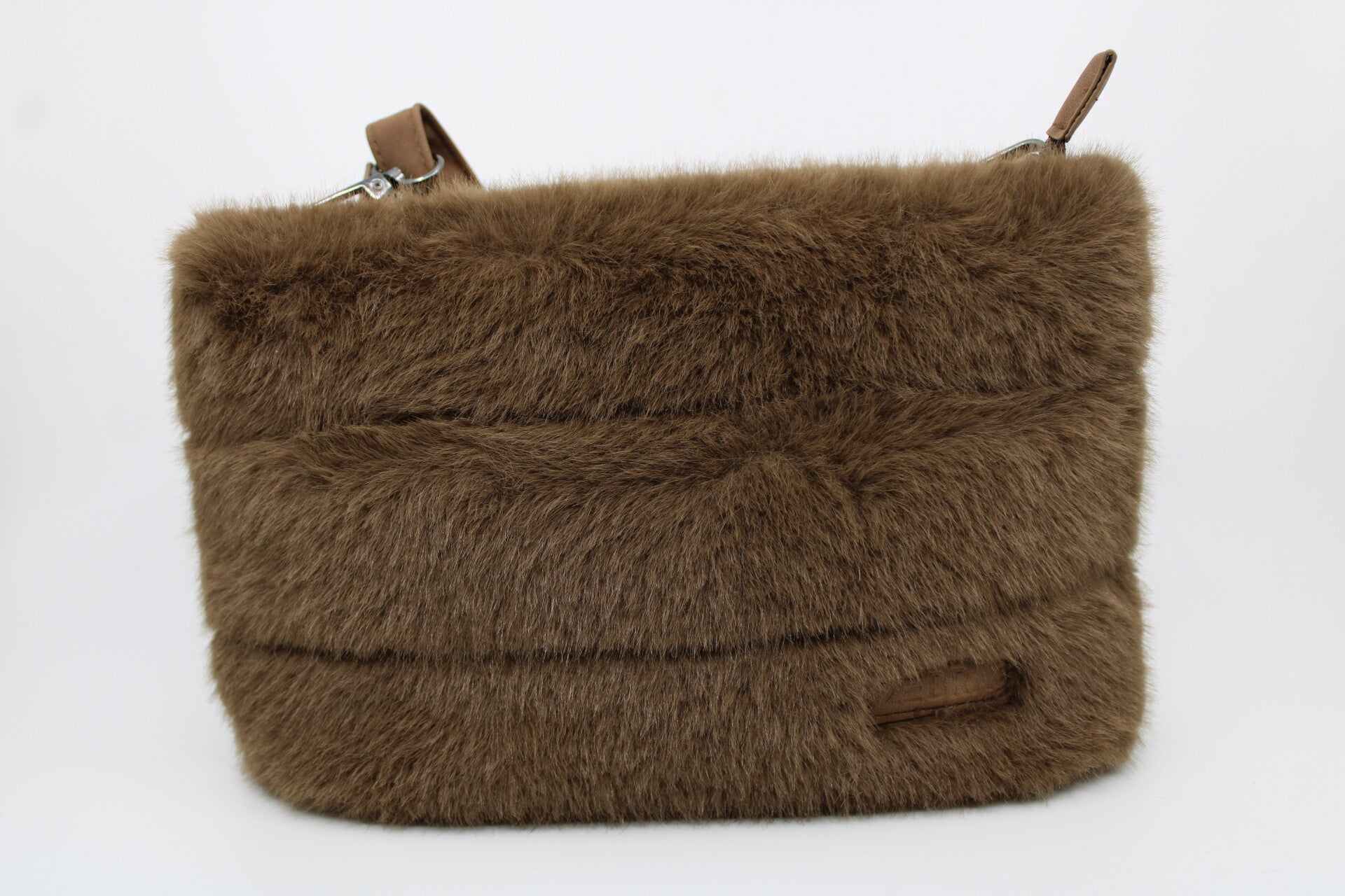 Langwerpig model van leuk bontmateriaal en ritssluiting bovenop. Met verstelbaar schouderhengsel.