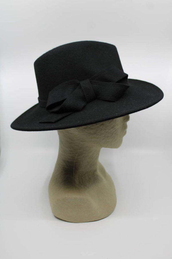 Prachtige basisgleufhoed in een middelgrote maat. Leuk afgewerkt met vilten band en strik. 11cm hoge bol en 8 cm de breedte van de rand. In 2 maten.