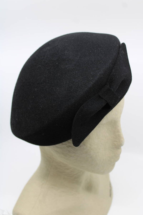 Royale dop die van voor wat hoger is en achter wat lager weg loopt. Subtiele strikgarnering. Mooi klassiek model en een luxe materiaal. Geschikt voor hoofdomtrek 56 tm 59 cm.