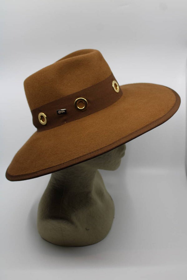 Royale hoed met flexibele rand, die niet heel strak maar wat speels valt. Luxe afgewerkt met een ringen band waar goudkleur in is verwerkt. Geschikt voor hoofdomtrek 56 tm 58 cm.