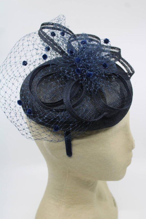 Haarbanddop in een rond model en daarmee geschikt voor de grotere hoofdomtrekken. Leuk om schuin naar het voorhoofd te dragen. Luxe garnering en bijpassende haarband.