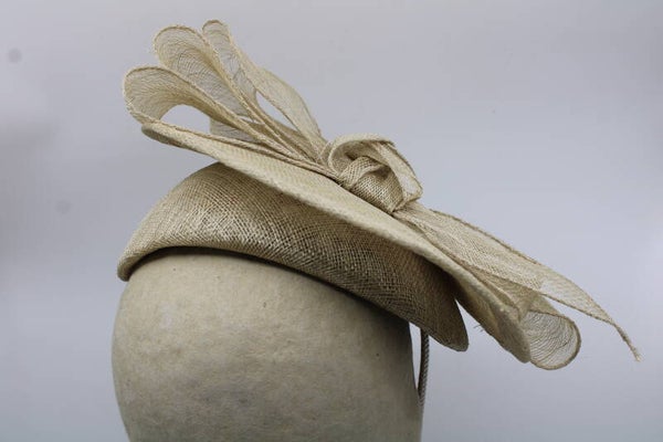Haarbanddop met mooie aansluitende basis dop, daarop een schotelgarnering en strik. Met bijpassende haarband. Geschikt voor hoofdomtrek vanaf 56cm.