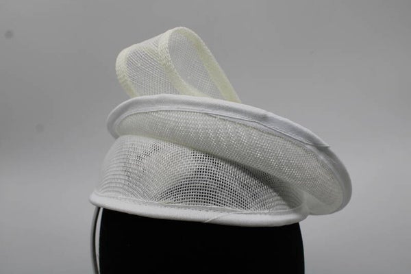 Dubbele dop waarvan de basis mooi aansluit op het hoofd en de schotel er als garnering opgezet is. Geschikt voor een hoofdomtrek van 54 tm 57cm. Garnering met gouddetail. Staat op stevige haarband.