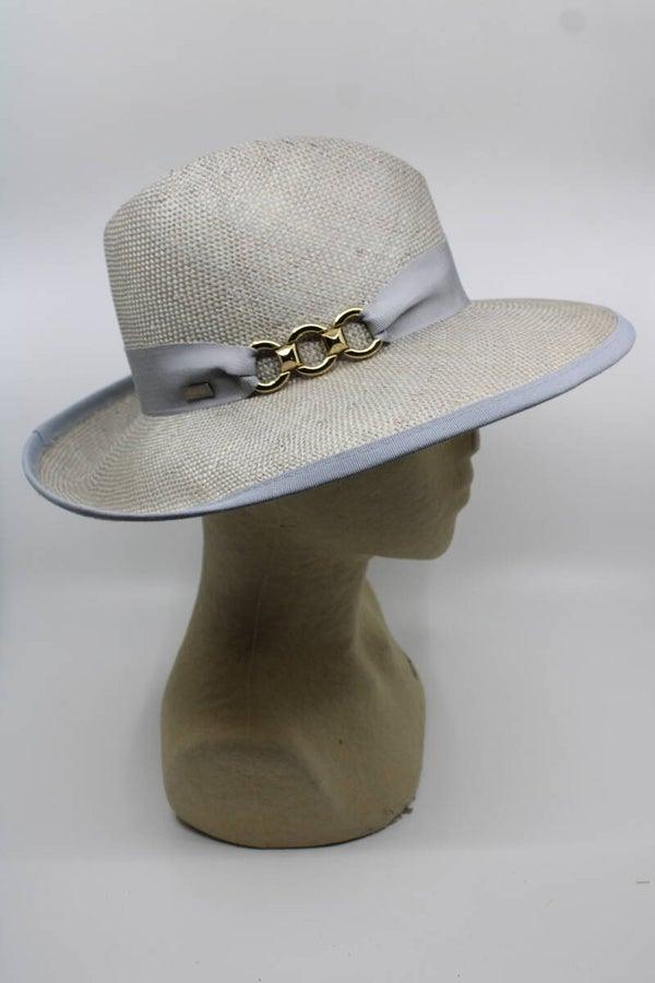 De grotere vorm van de 104. Gleufmodel met aan 1 kant het randje iets omhoog voor een speels effect. Luxe afgebiest en een goudkleurige gesp. Geschikt voor hoofdomtrek 56 t/m 58 cm.