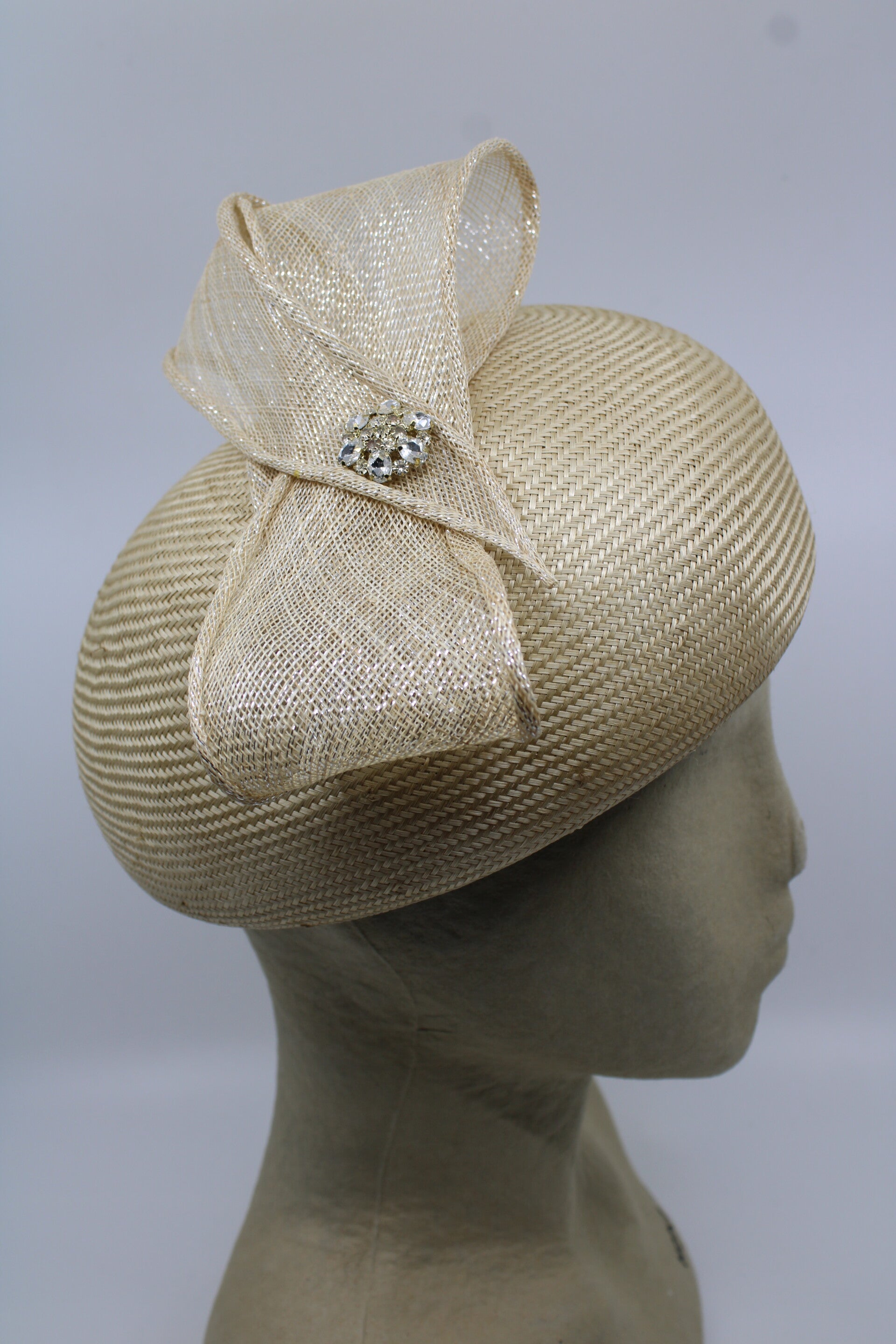 Rond model, geschikt voor een iets grotere hoofdomtrek 58 tm 60 cm. Luxe materiaal met een fijne glans. Strik garnering met strass.