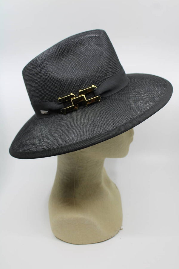 Gleufmodel met iets aflopende royale rand van 9,5cm. Luxe afgewerkt met ripsband langs de bol en de rand en goudkleurige gesp. Geschikt voor hoofdomtrek 56 t/m 58cm.