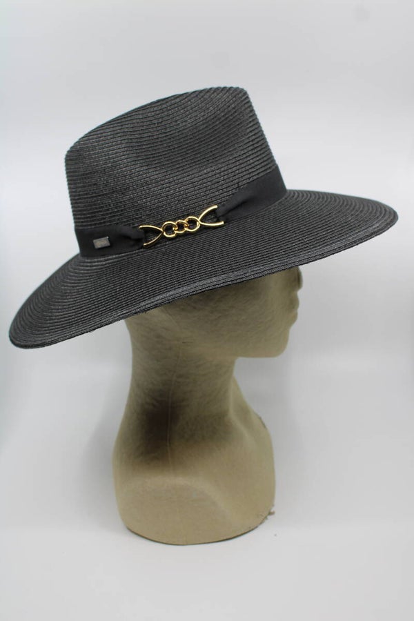 Gleufmodel met iets aflopende royale rand van 10,5cm. Luxe afgewerkt met ripsband langs de bol en goudkleurige gesp. Geschikt voor hoofdomtrek 56 t/m 58cm. Materiaal is naaistro.