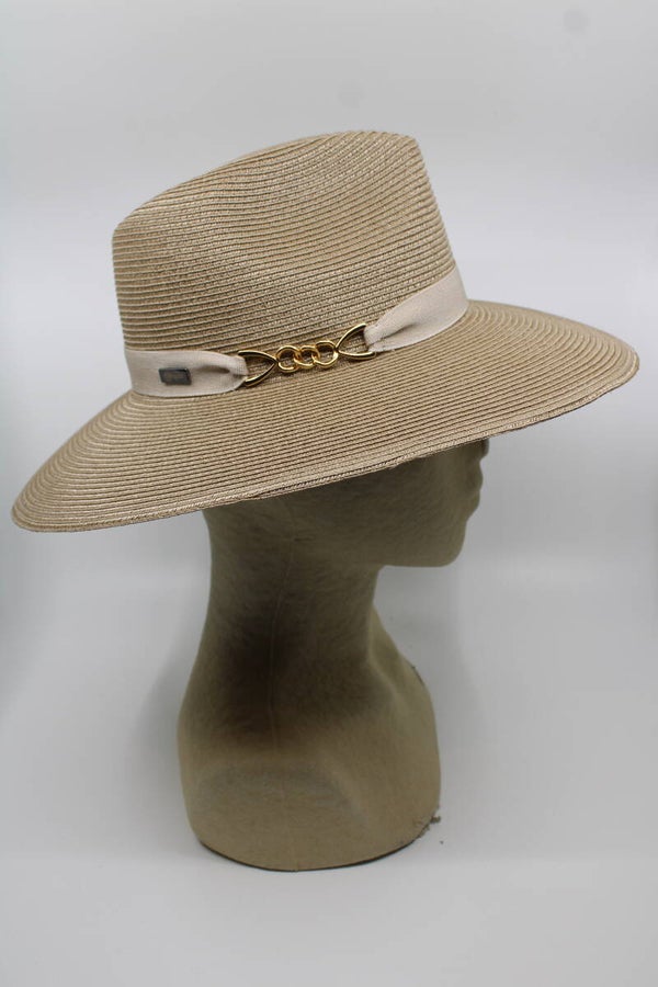 Gleufmodel met iets aflopende royale rand van 10,5cm. Luxe afgewerkt met ripsband langs de bol en goudkleurige gesp. Geschikt voor hoofdomtrek 56 t/m 58cm. Materiaal is naaistro.
