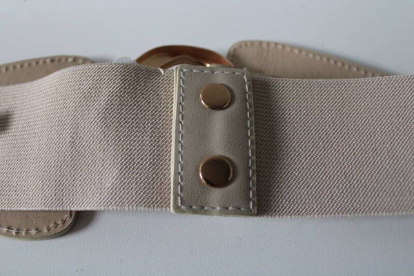 Leuke taille riem met leerlook en gouden gesp aan de voorzijde, achterkant elastiek met drukknoopsluiting.